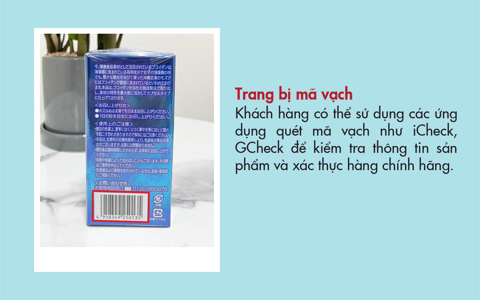 Sản phẩm Okinawa Fucoidan được trang bị mã vạch phía sau bao bì. Điều này cho phép khách hàng dễ dàng kiểm tra tính hợp lệ của sản phẩm khi mua hàng. Khách hàng có thể sử dụng các ứng dụng quét mã vạch như iCheck, GCheck để kiểm tra thông tin sản phẩm và xác thực hàng chính hãng.