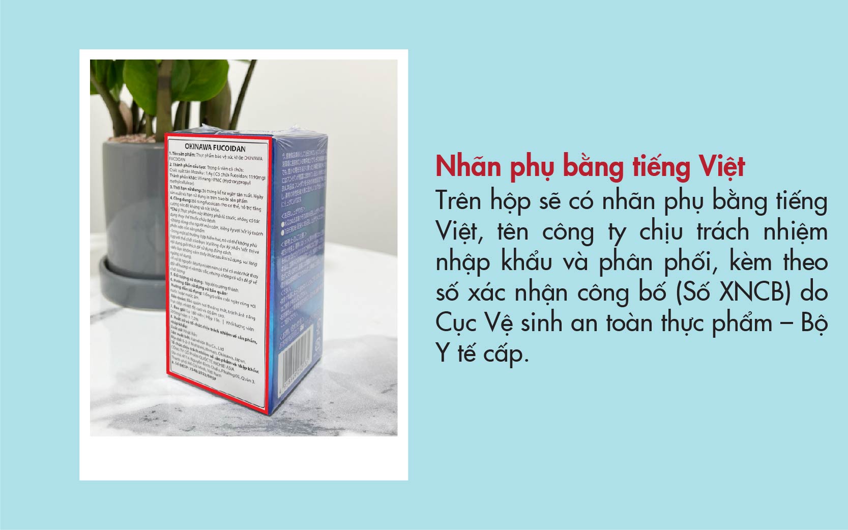 Bên cạnh đó, trên hộp Okinawa Fucoidan hàng chính hãng được bao seal cẩn thận, nhằm tránh các tác động xấu của môi trường. Đặc biệt, để đảm bảo tính chất nhập khẩu nguyên seal, tem chống giả không được dán trực tiếp lên vỏ hộp mà được đặt bên ngoài lớp bọc seal. Trên hộp sẽ có nhãn phụ bằng tiếng Việt, tên công ty chịu trách nhiệm nhập khẩu và phân phối, kèm theo số xác nhận công bố (Số XNCB) do Cục Vệ sinh an toàn thực phẩm – Bộ Y tế cấp.