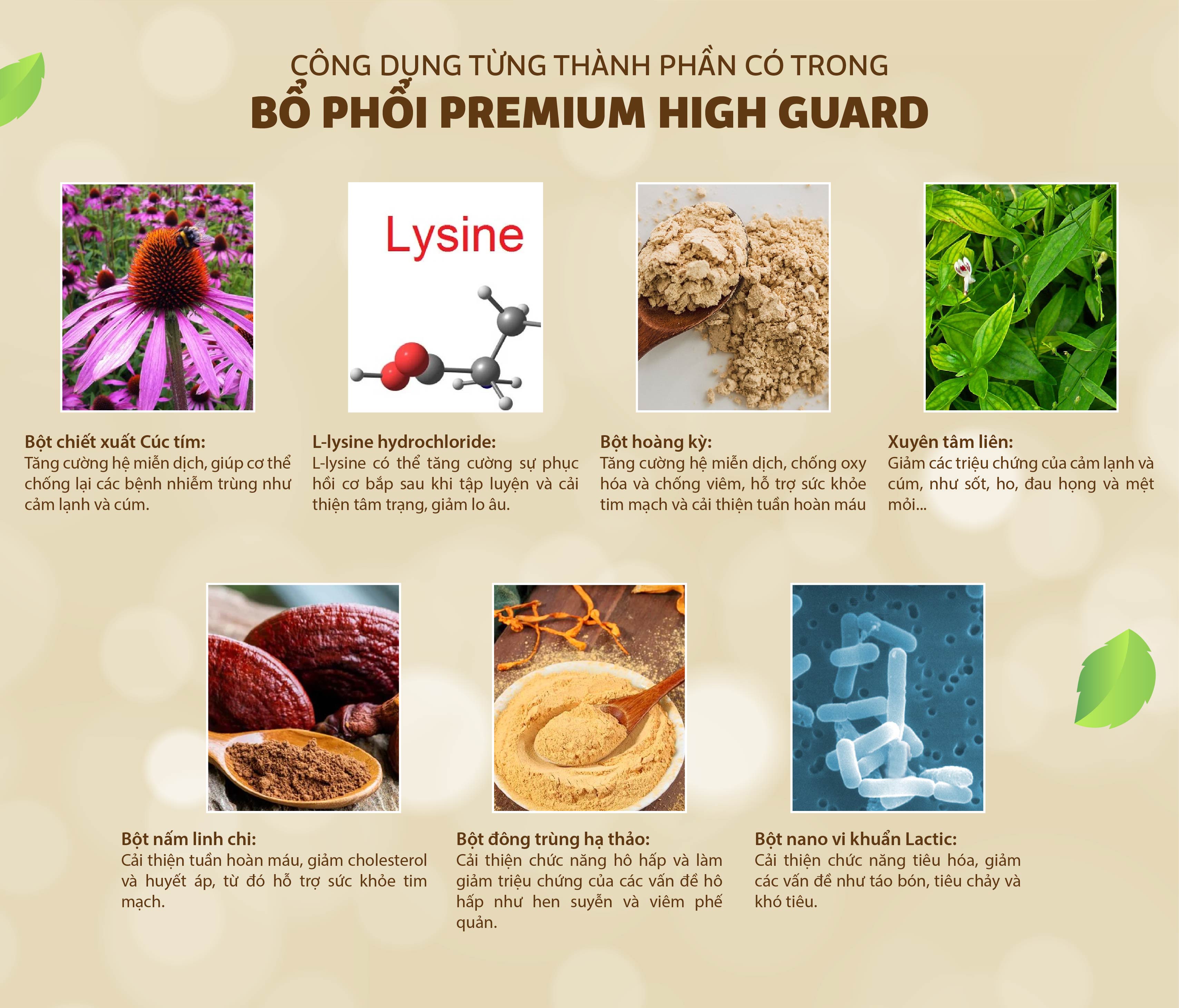 Côngdụng chính: Thực phẩm bảo vệ sức khỏe PREMIUM HIGH GUARD Hỗ trợ tăng cường sức đề kháng.