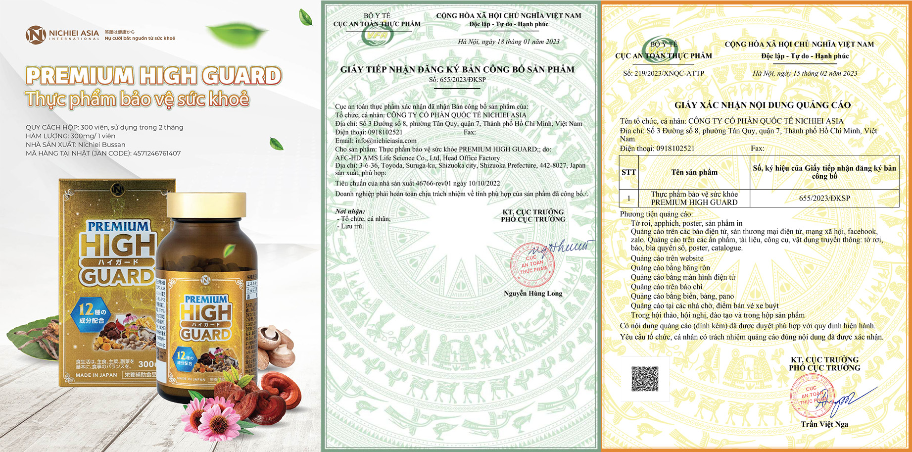 Thực phẩm bảo vệ sức khỏe PREMIUM HIGH GUARD được sản xuất bởi tập đoàn Nichiei Bussan được sản xuất 100% tại Nhật Bản. Nichiei Bussan trải qua gần 50 năm hoạt động trong lĩnh vực sản xuất các sản phẩm chăm sóc sức khỏe và y tế. Tập đoàn cũng thuộc thành viên của hiệp hội Thực phẩm Dinh dưỡng và Sức khỏe, uy tín nhất Nhật Bản (JHNFA) với người đứng đầu hiện tại là ông Eiji Yoshimura. Nichiei Bussan cam kết rằng, tất cả sản phẩm của chúng tôi đều đạt chất lượng từ các nguyên liệu đầu vào, các khâu sản xuất khép kín và luôn cập nhập các công nghệ hiện đại để với mỗi sản phẩm cho ra đời đều là những sản phẩm chúng tôi tự hào.