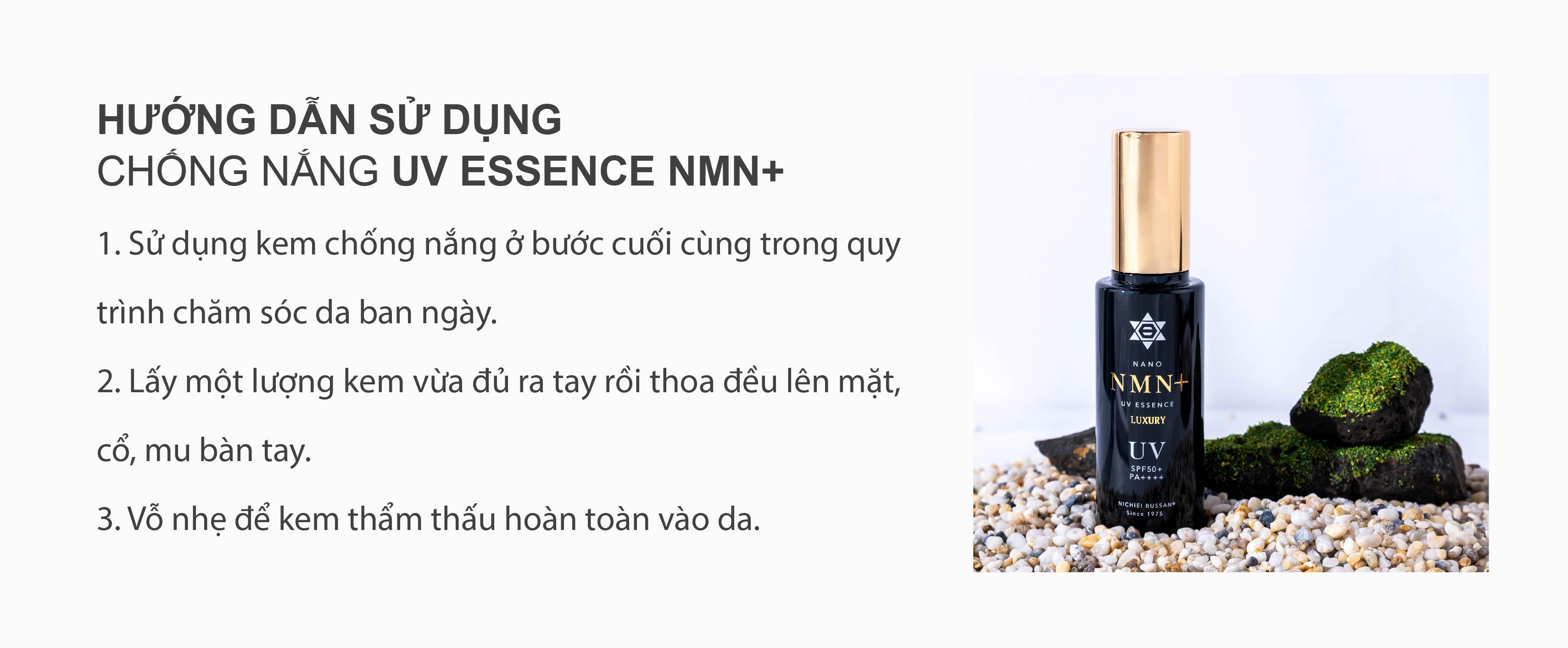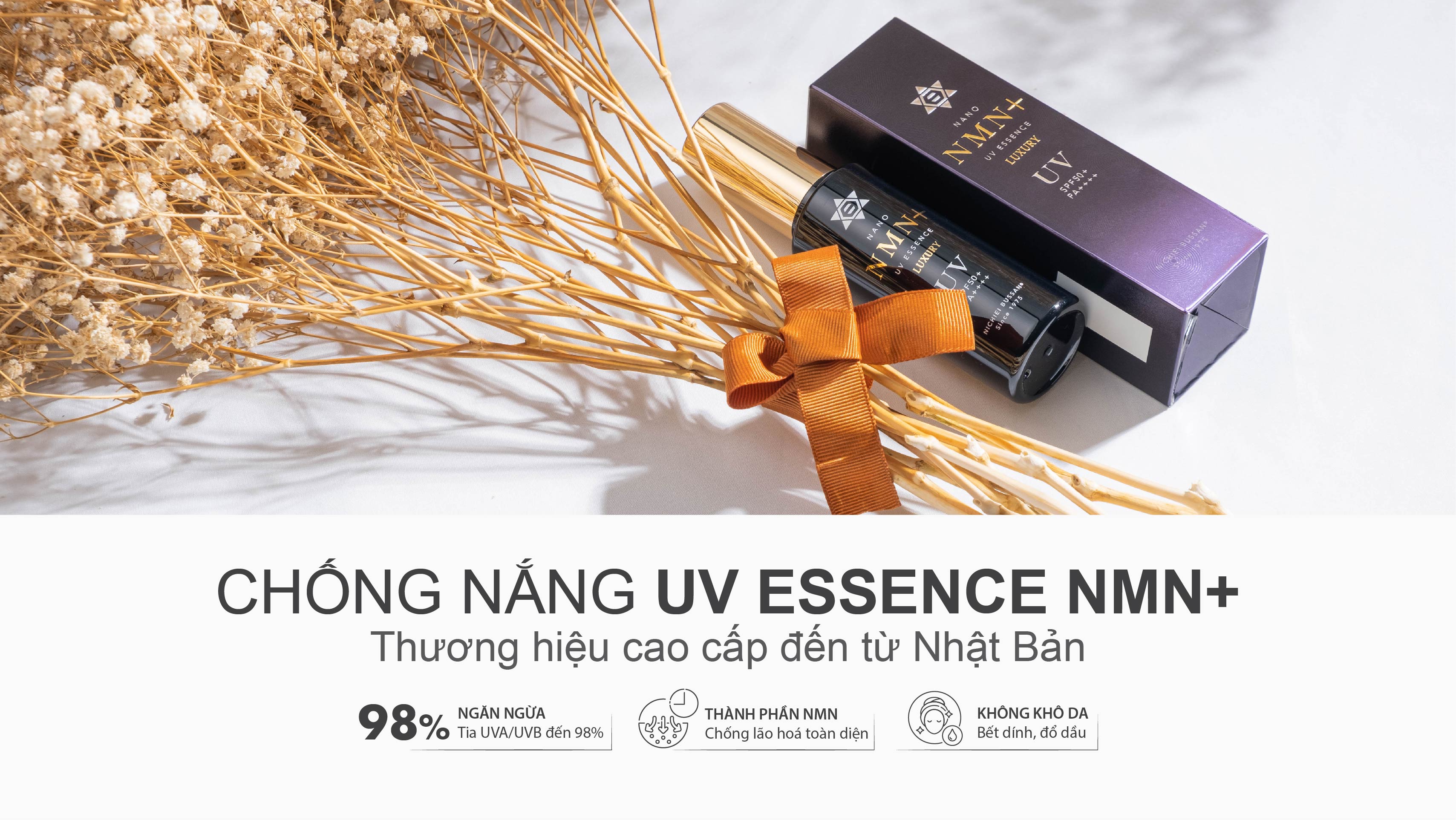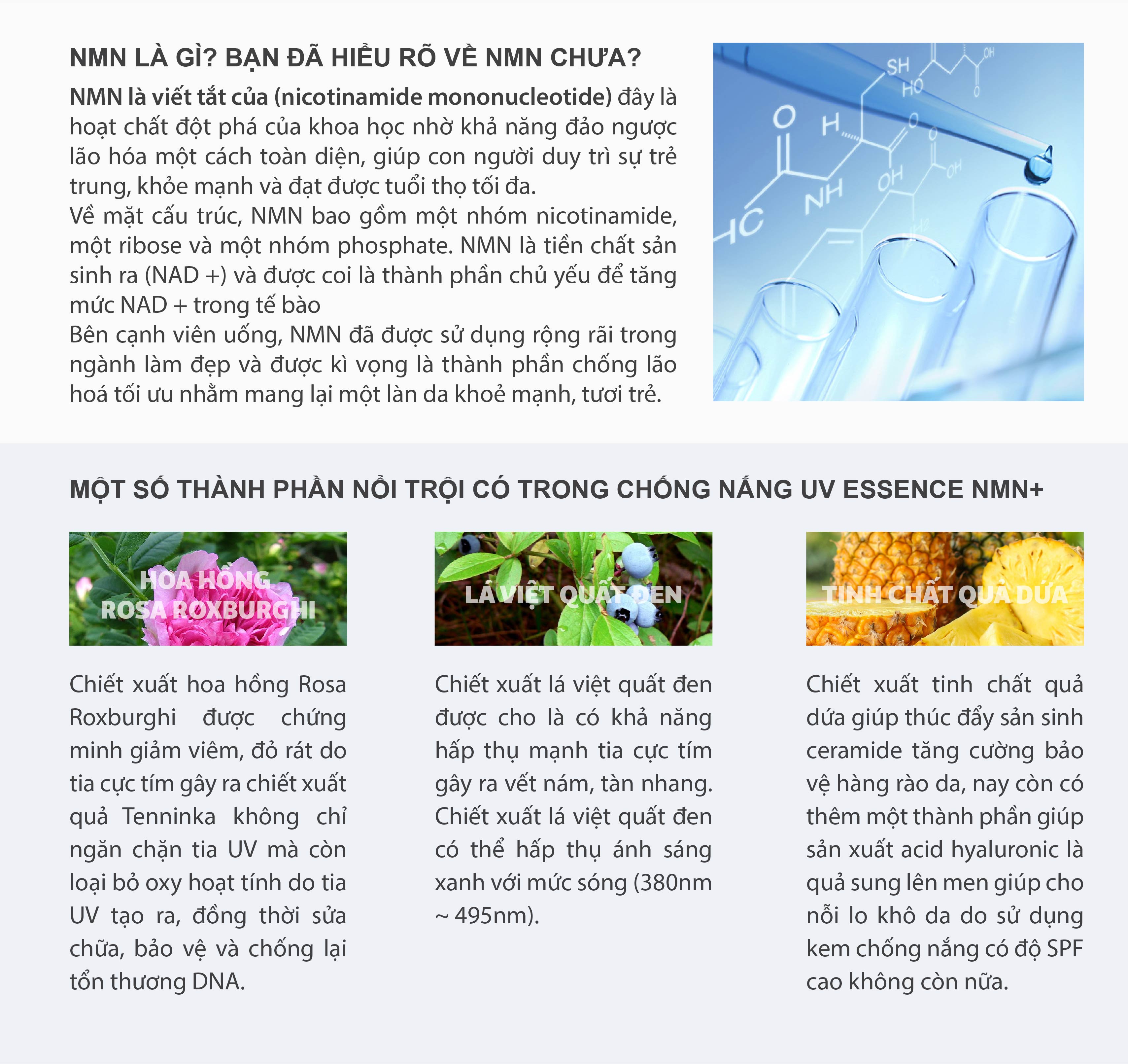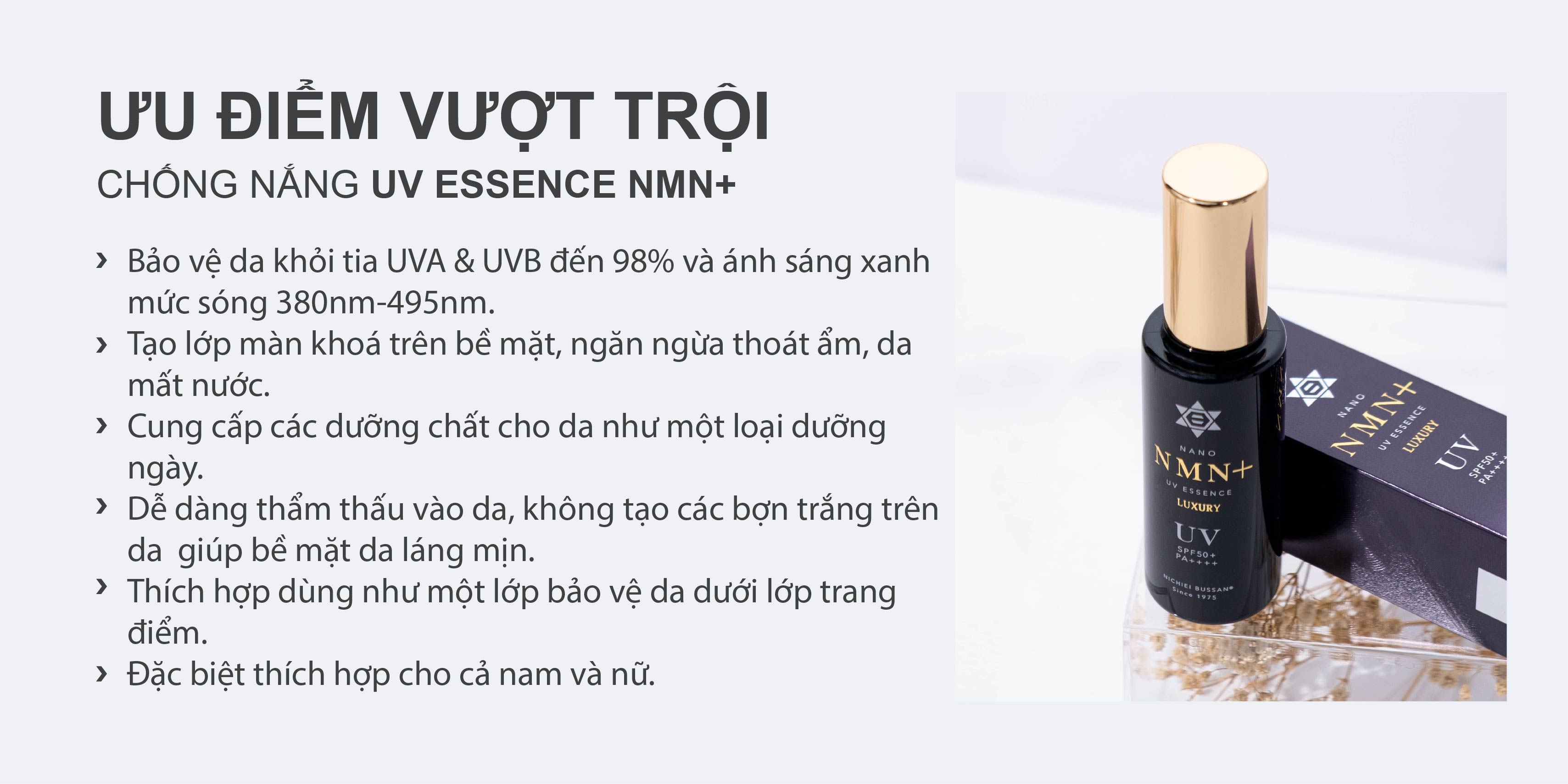 Công dụng chính: Chống nắng UV Essence NMN+ thương hiệu đến từ Nhật Bản 100% sản xuất và đóng gói tại Nhật. Kết hợp thành phần dưỡng da siêu chống lão hoá NMN, cam kết không khô da, bết dính, đổ dầu, tạo lớp màn khoá thông minh chống tia UVA/UVB trên bề mặt da hiệu quả