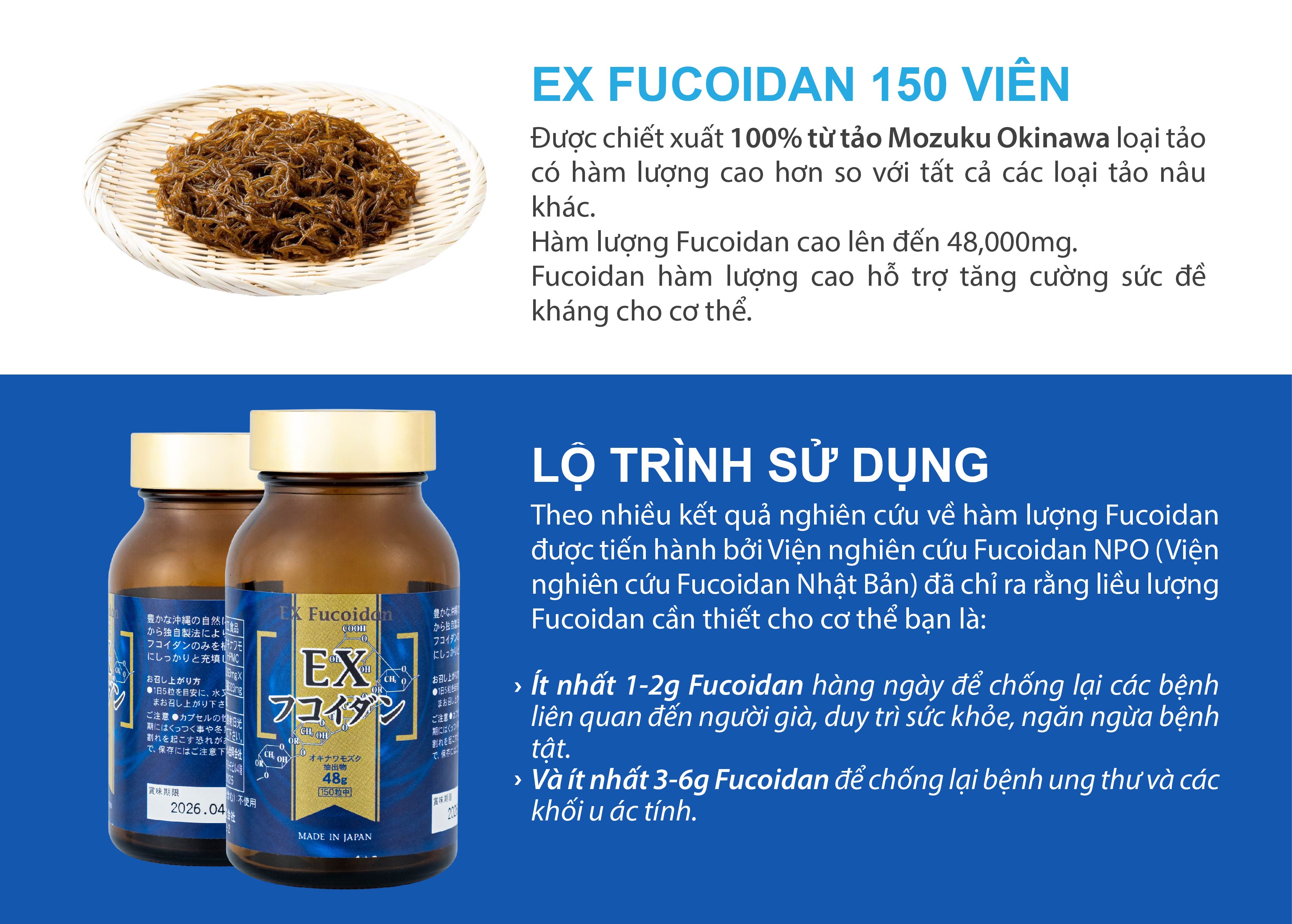 Thực phẩm bảo vệ sức khỏe EX Fucoidan được bào chế từ tảo nâu Mozuku được trồng tại vùng biển sạch Okinawa, Nhật Bản. Thành phần dinh có trong 5 viên Fucoidan EX (1.97g):