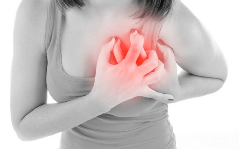 Bệnh nhân nhồi máu cơ tim thường có triệu chứng hồi hộp, đánh trống ngực. Đặc biệt xuất hiện cơn đau thắt ngực. Mức độ đau thắt ngực có thể dao động từ ít như kiểu đè nặng, đến mức đau dữ dội giống dao đâm, siết chặt. Cơn đau có thể lan ra các bộ phận như cổ, hàm dưới, vai trái, lưng, bụng, cánh tay trái. Thời gian kéo dài cơn đau từ 20 – 30 phút hoặc hơn. Ngoài ra, người bệnh còn có thể cảm thấy khó thở, vã mồ hôi, hoa mắt chóng mặt, ngất xỉu hay thậm chí là đột tử.