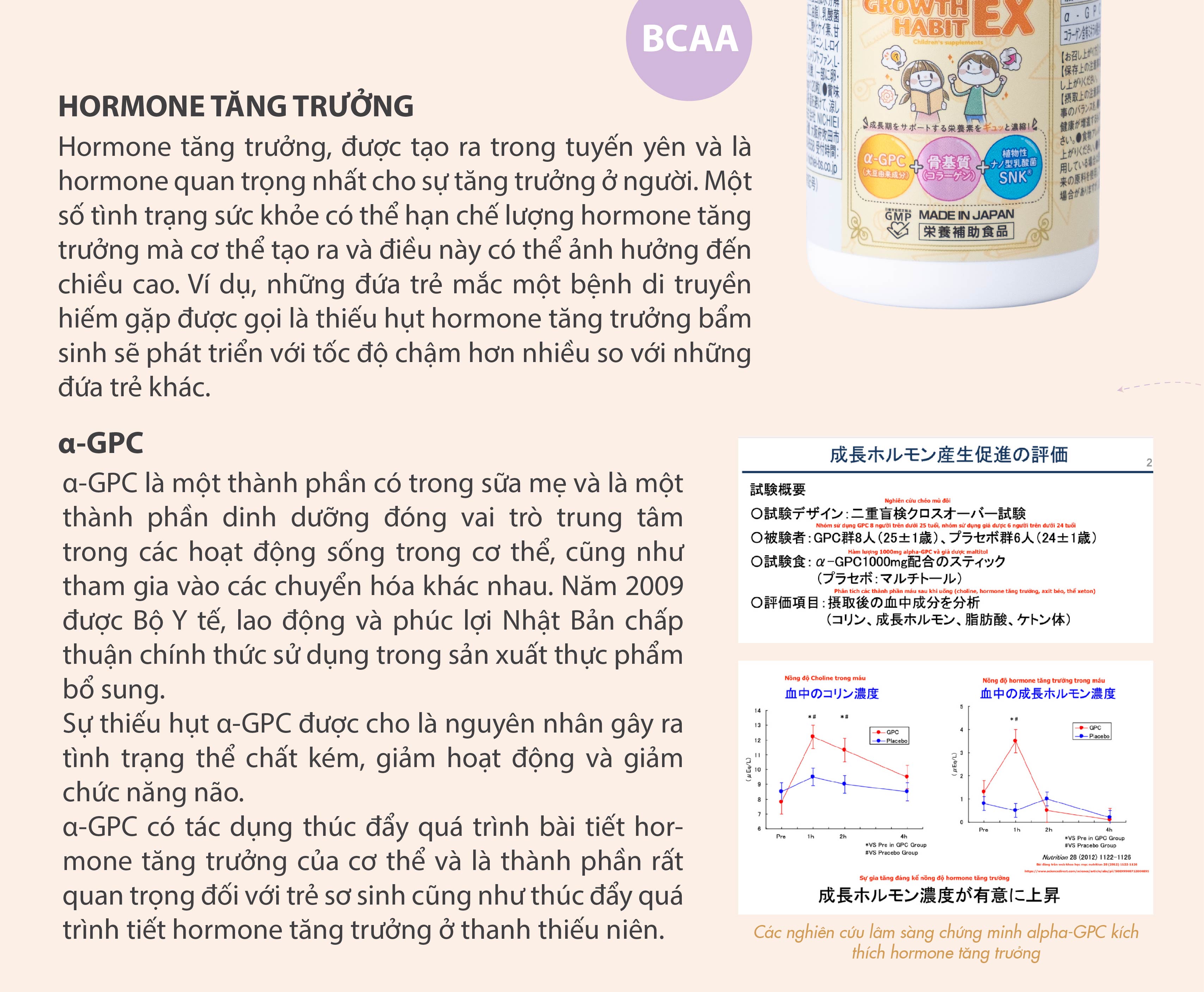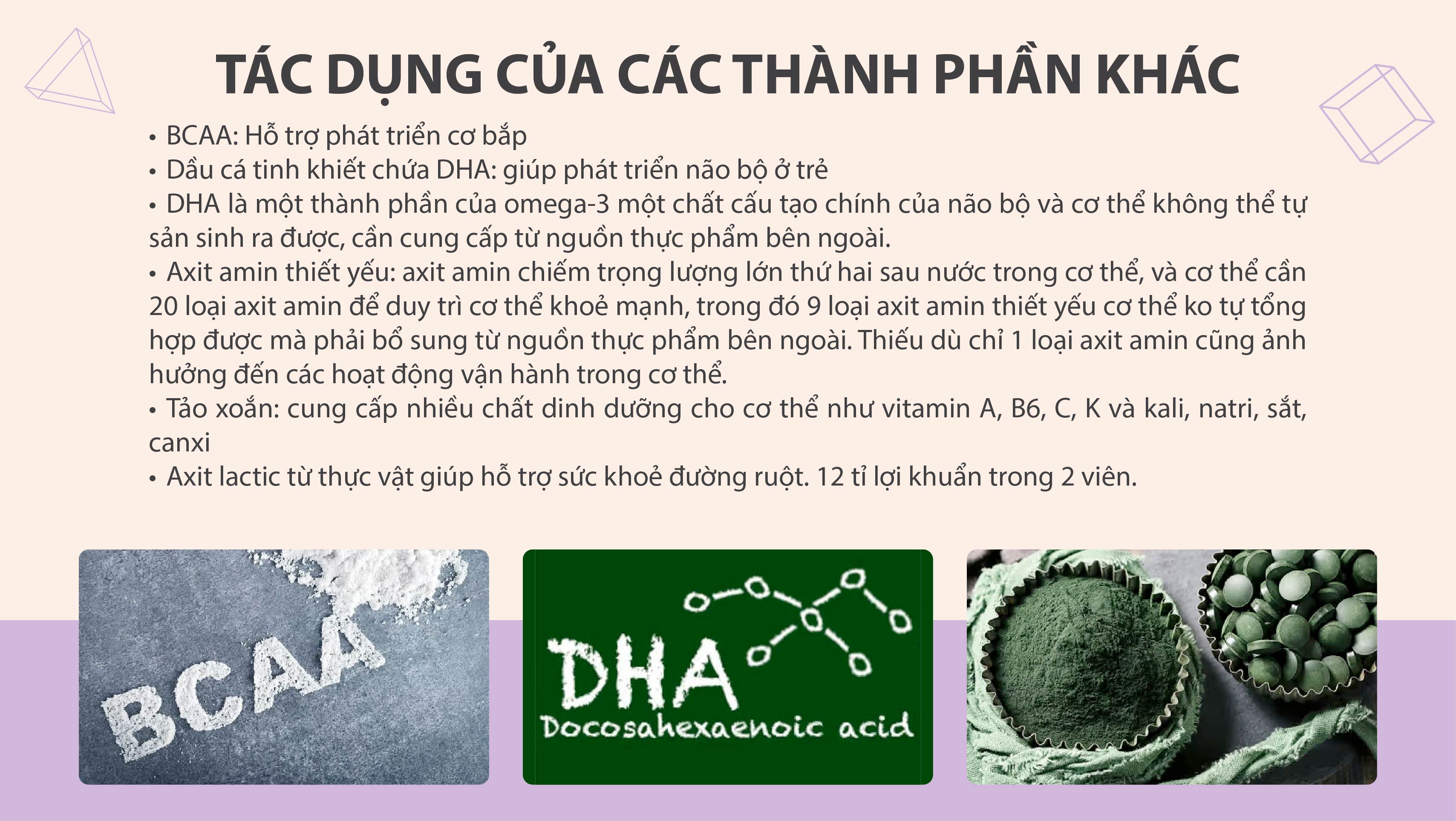 Thành phần chính: α-GPC, BCAA, Dầu cá tinh khiết chứa DHA, Casein phosphopeptide, Bột tảo xoắn,...