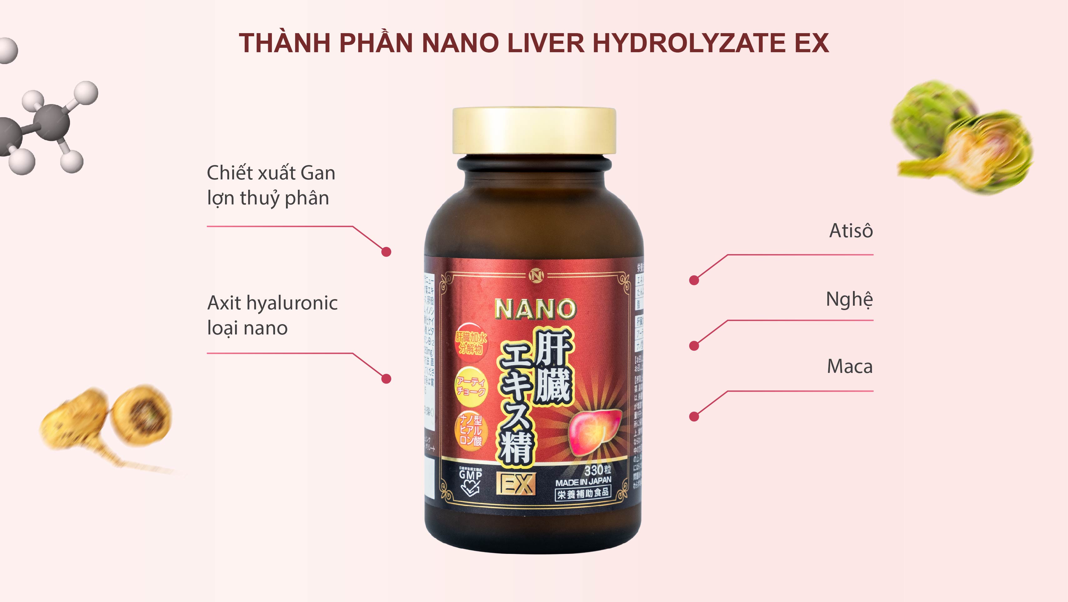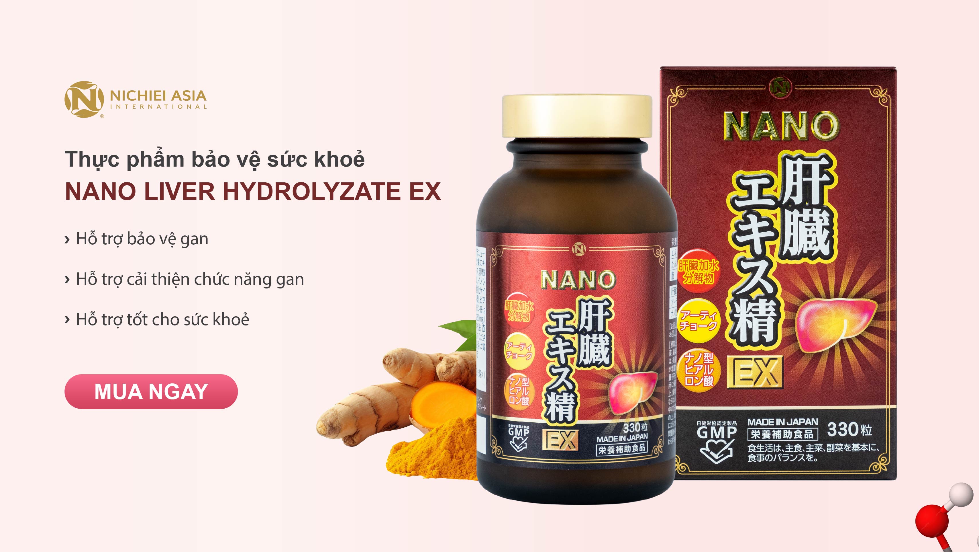 Thực phẩm bảo vệ sức khỏe Nano Liver Hydrolyzate EX - ĐƯỢC CHỨNG NHẬN JAPAN GMP. Sản phẩm được sản xuất tại Nhật Bản theo công nghệ hiện đại, đặc biệt là ứng dụng công nghệ Nano vào sản xuất làm giảm trọng lượng phân tử giúp cơ thể hấp thu dưỡng chất tốt hơn. Thực phẩm bảo vệ sức khỏe Nano Liver Hydrolyzate EX giúp hỗ trợ bảo vệ gan, hỗ trợ cải thiện chức năng gan và hỗ trợ tốt cho sức khỏe.