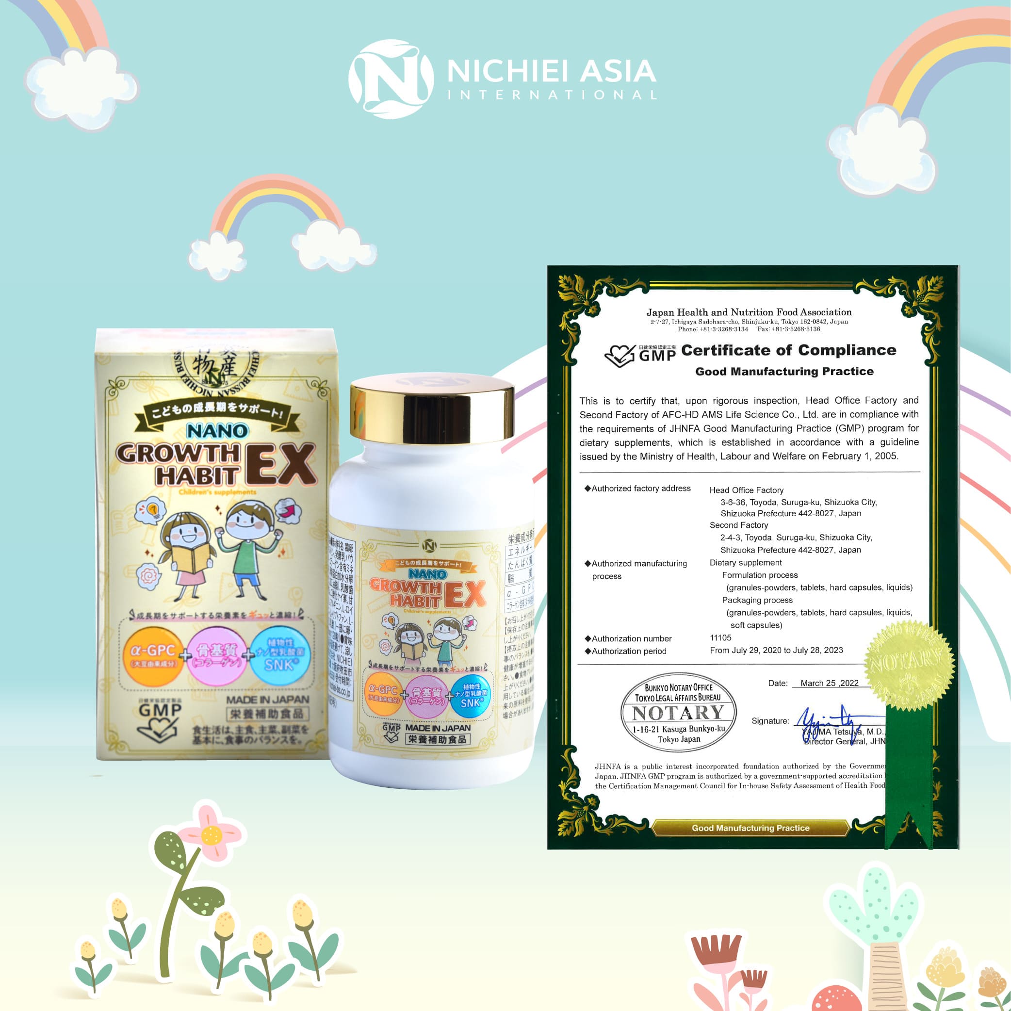 Viên uống bổ sung tăng chiều cao và phát triển trí não NANO Growth Habit EX được Nichiei Bussan nghiên cứu hơn 1 năm nhằm tìm kiếm các nguyên liệu thích hợp với cơ địa của trẻ nhỏ nhưng vẫn đem lại hiệu quả cao. Với các thành phần chính thúc đẩy phát triển xương và trí não như: